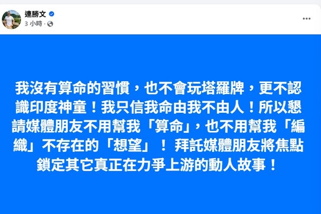 連勝文今日透過臉書嚴正否認相關傳聞。他強調自己“沒有算命的習慣,也不會玩塔羅牌,更不認識印度神童”,呼籲媒體不要再替他“算命”,也不要“編織不存在的政治想望”。連勝文說:“我命由我不由人,懇請媒體朋友將焦點鎖定在真正值得關注、正在力爭上游的動人故事上。” |