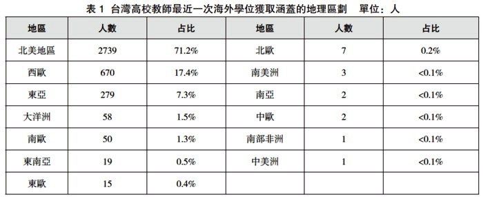 表1:台灣高校教師最近一次海外學位獲取涵蓋的地理區劃