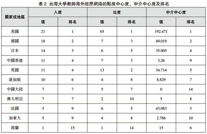 表2:台灣大學教師海外經歷網絡的點度中心度、中介中心度及排名