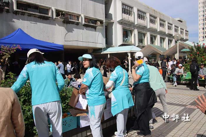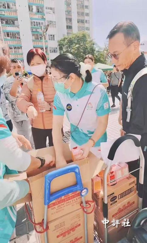 身穿十五運香港賽區志願者服裝的香港保定海外聯誼會會長梁磊與會員夥伴在發放物資(中評社 盧哲攝)