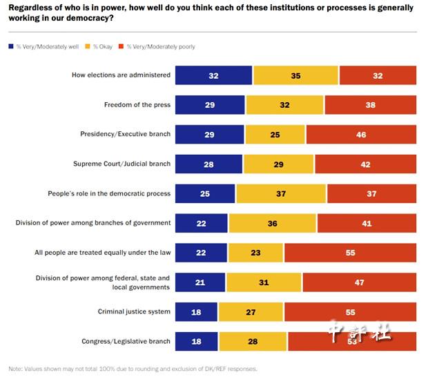 然而,另一個“清晰”的矛盾是,民眾對於多元化、協商妥協和反對暴力的熱切期待與機構和領導人不受信任的現實存在巨大的反差。調查發現,很少有美國人信任機構和政治領導人,對支撐民主的機構的信心低得驚人。近一半的人(46-47%)認為美國總統和行政部門、聯邦和地方政府部門運作不良;對立法部門和刑事司法系統獲得的信任度最低,認為他們運作不良的比例超過一半(53-55%)。55%的人認為美國沒有做到“法律面前、人人平等”。