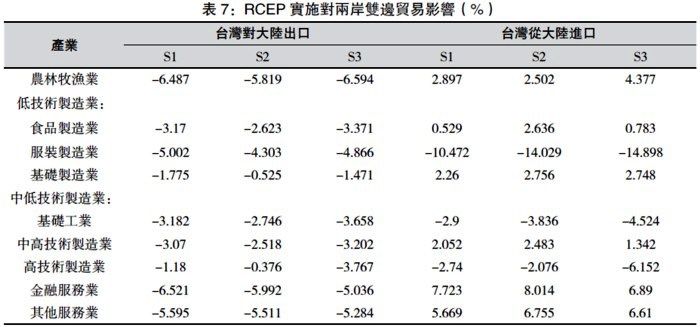 [表7:RCEP實施對兩岸雙邊貿易影響(%)產業]