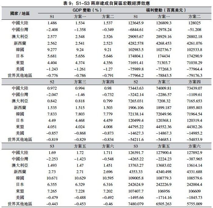 [表9:S1-S3兩岸建成自貿區宏觀經濟效應國家/地區]