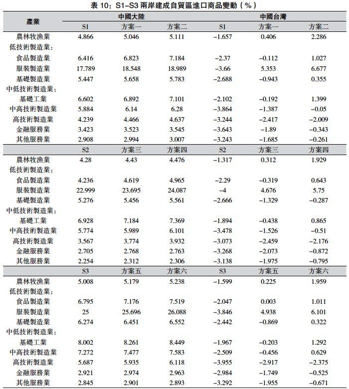 [表10:S1-S3兩岸建成自貿區進口商品變動(%)產業]