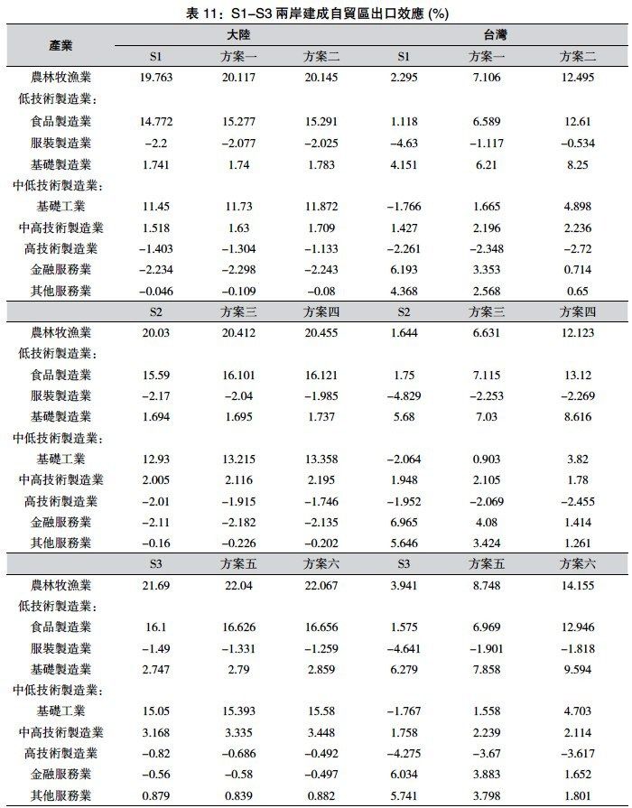[表11:S1-S3兩岸建成自貿區出口效應(%)]