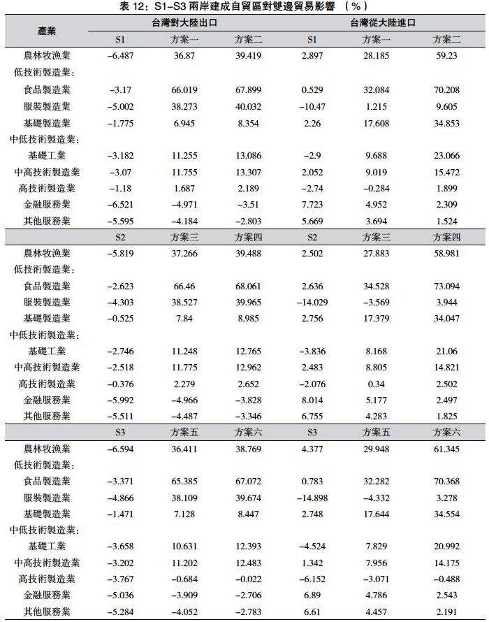 [表12:S1-S3兩岸建成自貿區對雙邊貿易影響(%)產業]