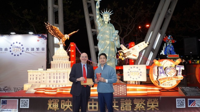 蔣萬安日前與谷立言一起為AIT在台北燈節展出點燈。(取自AIT臉書)