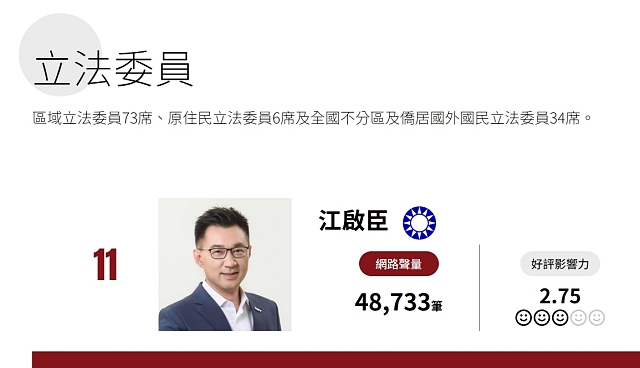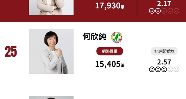 根據“網路溫度計”統計數據,近一個月政治人物聲量,江啟臣在“立委”類別排行11名、楊瓊瓔17名居次、何欣純則落後至25名;在政治人物全榜方面,江啟臣排行26名、楊瓊瓔39名、何欣純則是55名。換言之,何欣純雖然已就戰鬥位置,討論度卻被藍營黨內競逐相關議題嚴重稀釋,何陣營或許也始料未及。