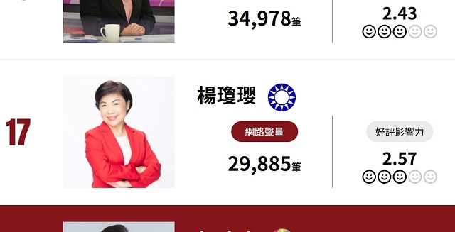 楊瓊瓔網路聲量排名17名。(網路溫度計)