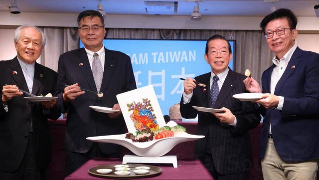 前駐日代表謝長廷(右二)、綠委郭國文(右一)、台北大同扶輪社長李明峻(左二)共同享用日本水產。(照:郭國文臉書)