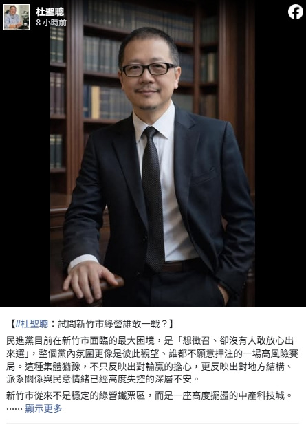 針對2026年新竹市長選舉議題,學者杜聖聰在臉書發文表示看法。(照:杜聖聰臉書)