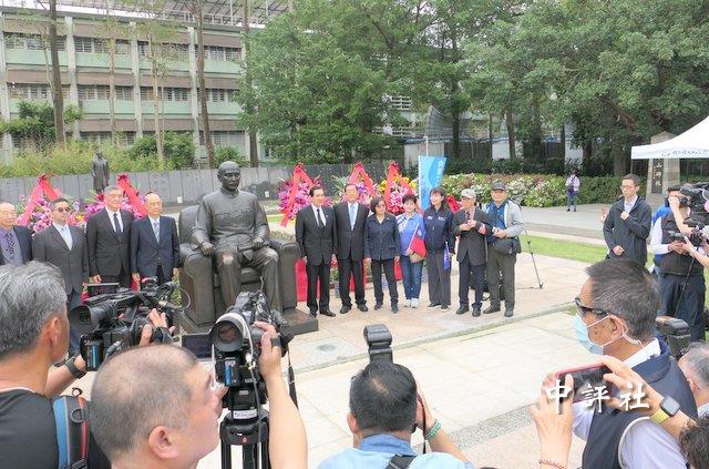 馬英九等人在國父紀念館向孫中山銅像獻花致敬。(中評社 張嘉文攝)