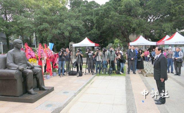 馬英九前往國父紀念館向孫中山銅像獻花致敬。(中評社 張嘉文攝)