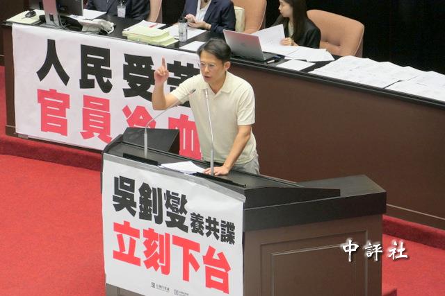 中評社台北7月4日電(記者 張嘉文)台灣民眾黨今天在立法院院會提議,鑑於府院黨遭陸諜滲透,包括國安會祕書長吳釗燮的機要秘書也淪陷,但吳神隱至今,因此建請院會做出決議,吳釗燮應負政治責任下台。