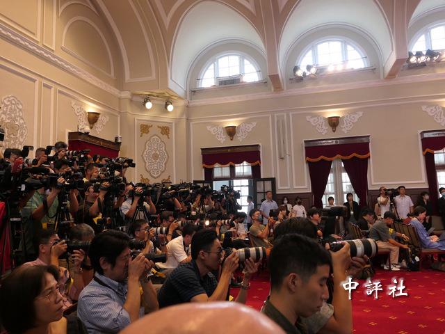 府方1日舉行“因應美國對等關稅政策記者會”,大批媒體前往採訪。(中評社 張穎齊攝)