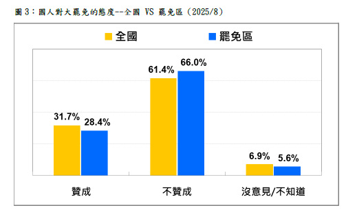 第二,從罷區的二都二縣看,新北市,三成四同意罷免,五成四不同意;台中市,三成同意罷免,五成七不同意;南投與新竹二縣平均,三成三同意罷免,五成一不同意。