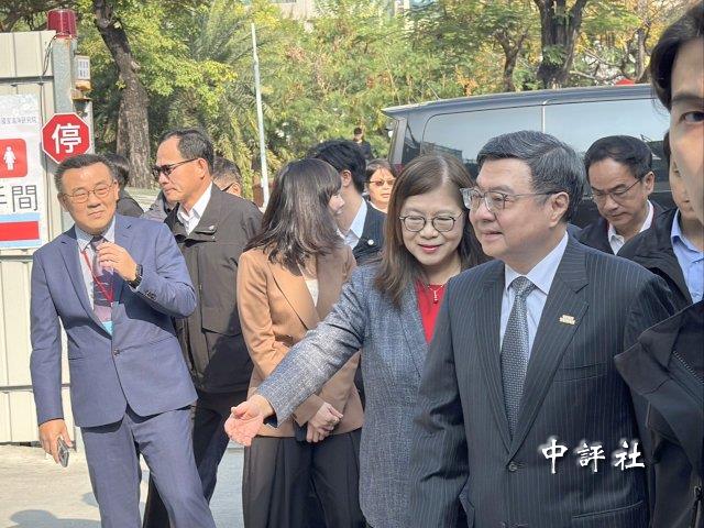 “行政院長”卓榮泰19日上午到高雄出席“海委會”活動,下車時“海委會主委”管碧玲迎接。(中評社 蔣繼平攝)