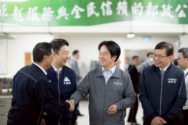 賴清德今天赴中華郵政台北郵局進行視察並聽取簡報,一抵達北門郵局時先接受媒體訪問。接著由交通部長陳世凱、中華郵政董事長王國材陪同下,視察台北郵局快捷郵件投遞作業情況並勉勵工作人員。