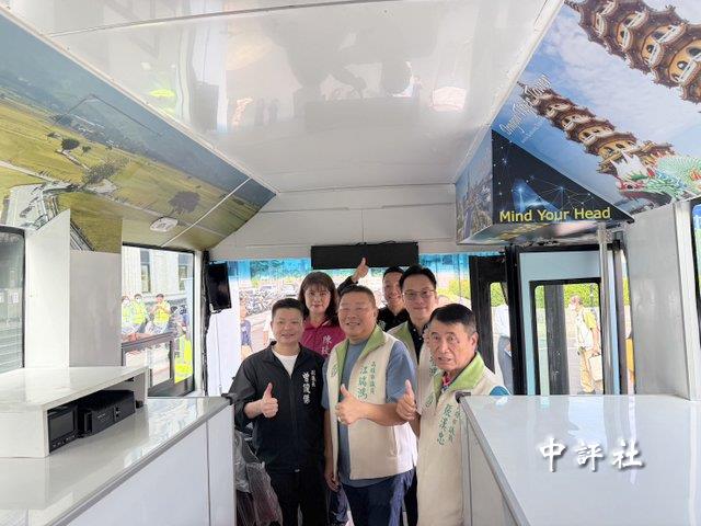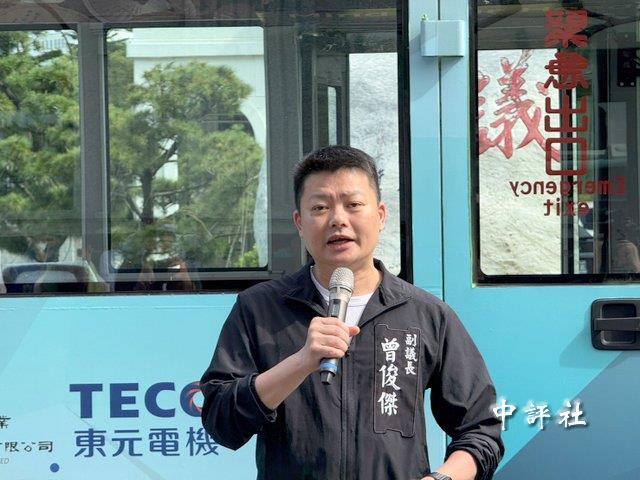 由高雄在地企業氫谷動能自主研發的台產氫能巴士30日在高雄市議會前舉辦啟航典禮亮相,活動吸引無黨籍高雄市副議長曾俊傑率領藍、綠民代上車參觀。(中評社 蔣繼平攝)