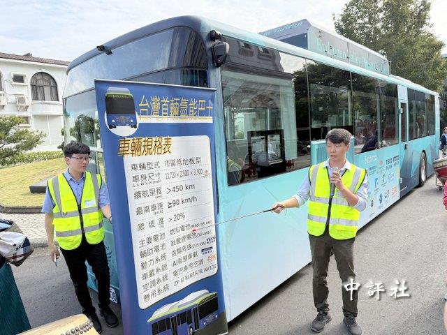 由高雄在地企業氫谷動能自主研發的台產氫能巴士30日在高雄市議會前舉辦啟航典禮亮相,廠商進行車輛規格介紹。(中評社 蔣繼平攝)