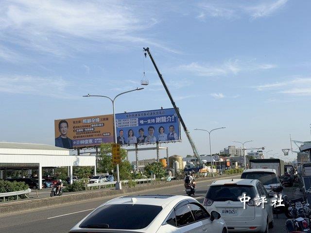 可望代表中國國民黨參選台南市長的藍委謝龍介31日下午在台南市仁德區大同路三段掛上首波“團結台南聯合看板”,現場出動大型吊車作業。(中評社 蔣繼平攝)