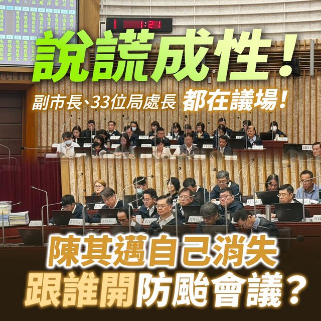白喬茵質疑,陳其邁消失時,市府33位局處長和3位副市長都坐在議場,陳是和誰開防颱會議?(白喬茵臉書)
