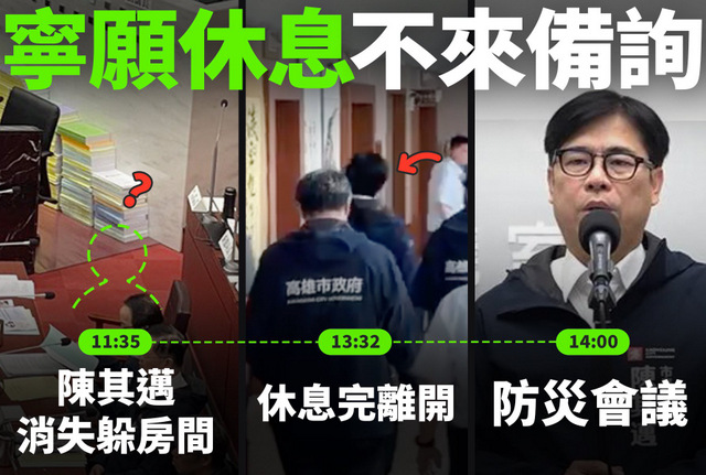 白喬茵透露,陳其邁被拍到11時35分離開議事廳躲進休息室,直到13時32分才離開議會。也就是,他人根本沒去甚麼防災會議,而是在議會小房間裡展開兩個小時的大休息,懶得面對議員的眾多質疑。