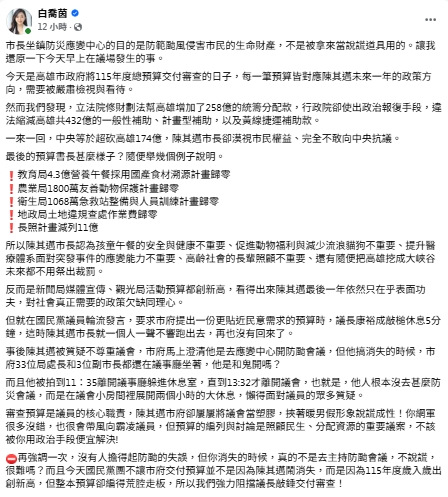 白喬茵指出,沒有人擔得起防颱的失誤。但陳消失的時候,真的不是去主持防颱會議,不說謊,很難嗎?而且今天國民黨團不讓市府交付預算並不是因為陳其邁鬧消失,而是因為2026年度歲入歲出創新高,但整本預算卻編得荒腔走板,“所以我們強力阻擋議長敲錘交付審查”!