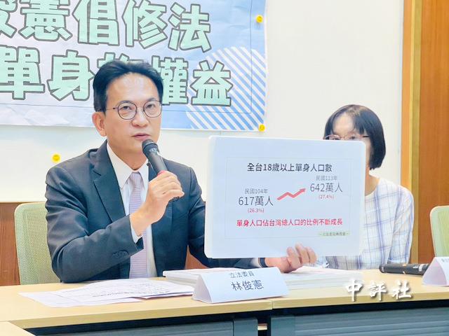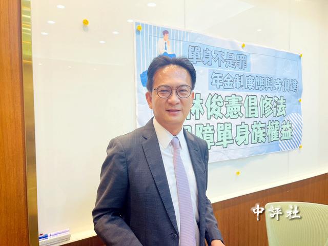 上午10時,林俊憲接棒開“單身不是罪,年金制度應與時俱進”記者會,與陳亭妃“王不見王”,林俊憲主張修法保障單身族權益,他指出台灣單身人口已達642萬人,勞保年金制度應與時俱進,不能讓單身族在退休後喪失保障。