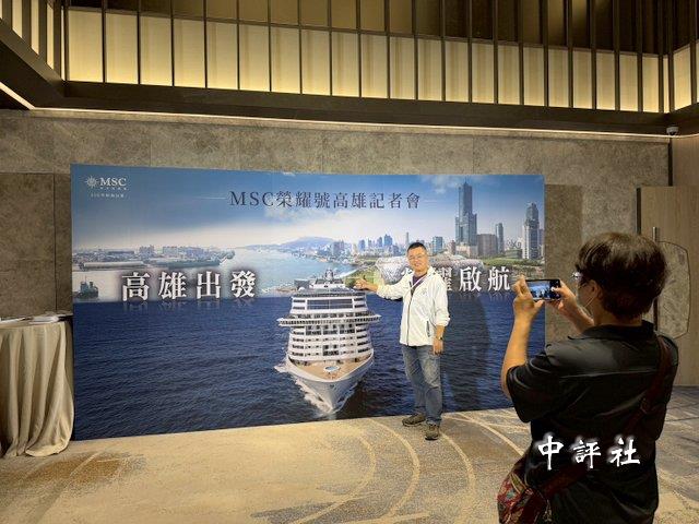 MSC地中海郵輪公司14日在高雄日航酒店舉辦“MSC榮耀號郵輪高雄首航記者會”,與會人士與郵輪看板拍照。(中評社 蔣繼平攝)