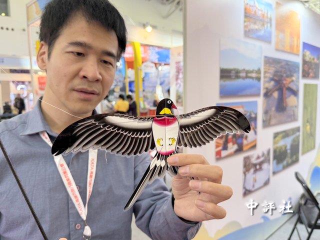 高雄市旅行公會冬季國際旅展有設攤介紹北京景點,國家級非遺“曹雪芹風箏”第四代傳承人繆伯剛在場解說,並介紹“沙燕風箏”是北京傳統風箏典型樣式。(中評社 蔣繼平攝)