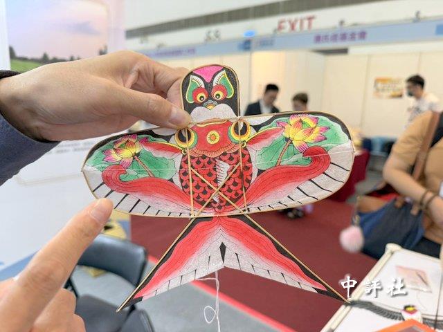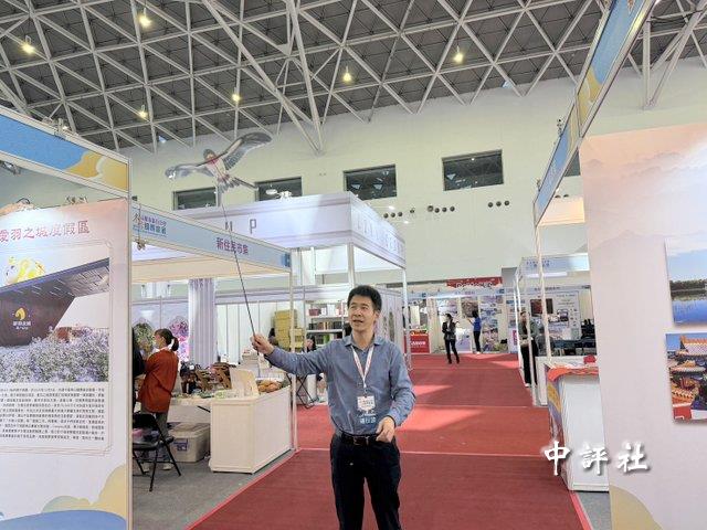 高雄市旅行公會冬季國際旅展有設攤介紹北京景點,國家級非遺“曹雪芹風箏”第四代傳承人繆伯剛介紹攤位準備的文創小物。(中評社 蔣繼平攝)