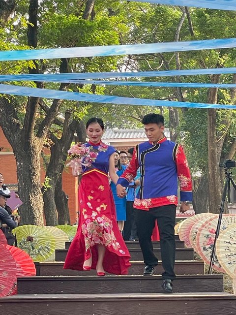 新人在八音樂聲及象徵“起家”的帶路雞引領下緩緩進場,典雅的客家禮服於綠蔭中展現傳統與現代的融合之美,儀式依循客家傳統進行“上燈”、“插頭花”與“食新人茶”,象徵家族興旺、兩家結親與長輩祝福,使婚禮更添溫馨與文化深意。