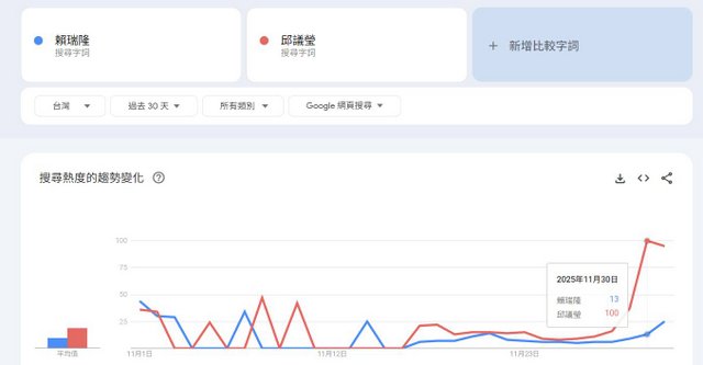 陳冠安1日在臉書發文表示,以Google Trends的搜尋趨勢來看,在蘇貞昌站台的1130鳳山造勢之前,邱議瑩的聲量與賴瑞隆平分秋色,最多小有領先。然後1130當天,邱議瑩的網路聲量一飛衝天,單日7倍於賴瑞隆。也因此帶動整體聲勢,在過去30天內,邱2倍於賴。