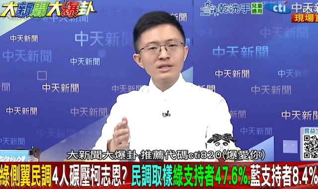 侯漢廷2日在《大新聞大爆卦》節目表示,不論是否林岱樺出線,“高雄都會是柯志恩當選!”看TVBS民調的樣本數發現,前一家晴雨民調做出來的,國民黨支持者少得可憐!不到10%,當然做出來整體支持度就比較低。
