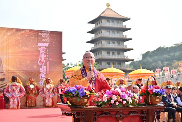 中華傳統宗教總會會長暨佛光山住持心保和尚,25日在於世界神明會聯誼會中致詞。(照:佛光山提供)