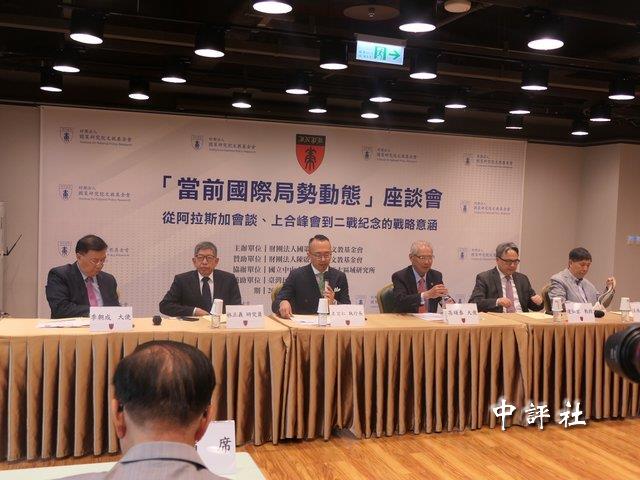 “國策研究院”文教基金會4日在張榮發基金會舉行“當前國際局勢動態”座談會,主題為“從阿拉斯加會談、上合峰會到二戰紀念的戰略意涵”。與談的有“國策研究院”董事長兼院長田弘茂、“國策研究院”執行長王宏仁、“國策研究院”資深顧問及台灣前駐美代表高碩泰、“中研院”歐美所研究員林正義、政治大學外交學系教授兼戰略與國際事務碩士在職專班執行長連弘宜、國際合作發展基金會資深顧問李朝成、華視“三國演議”節目主持人汪浩。