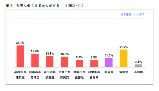 民調另外詢問,“在目前六都市長,蔣萬安、侯友宜、張善政、盧秀燕、黃偉哲、陳其邁等六人當中,您最不欣賞的是哪幾位?”結果發現:台灣人最不欣賞的六都市長,依序是:第一,高雄市長陳其邁27.1%;第二,台南市長黃偉哲16.8%;第三、新北市長侯友宜13.7%;第四,台北市長蔣萬安13%;第五,桃園市長張善政9%;第六,台中市長盧秀燕8.9%;11.3%都不欣賞,21.9%沒意見,3.5%不知道、拒答。