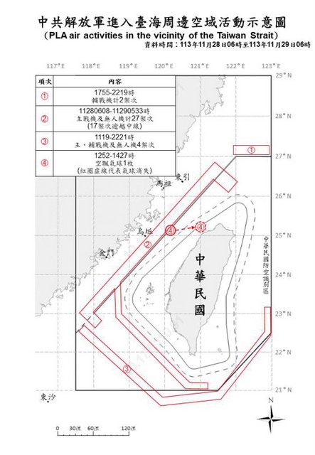 中評社台北11月29日電/《華爾街日報》報導,賴清德出訪將途經夏威夷與美屬關島,已引發北京的譴責,並可能促使北京進行軍事演習作為回應。而昨天晚間至今天清晨6時許,大陸共派出33架次戰機與8艘艦艇,以三面圍台的方式進行遠海訓練,一度從南方飛到台灣東部外海。
