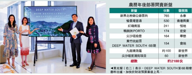 大公報報導,會地副主席兼常務董事黃光耀表示,近期樓市氣氛延續旺勢,決定加快推盤節奏。DEEP WATER SOUTH第6B期樓書昨日新鮮出爐,建有1A及1B兩座,提供154夥,包括90夥三房、58夥四房戶及6夥連天台或平台特色戶,標準戶實用面積由862至1696方呎,特色戶則由837至2642方呎,面積最大為頂層天際特色戶,四房三套加娛樂室及工作間連洗手間間隔,全期僅得1夥。黃光耀憧憬財政預算案或有利好樓市措施,籌備農曆年後開放示範單位及落實銷售安排,傾向全數單位以招標形式發售,首批推出最少31夥。