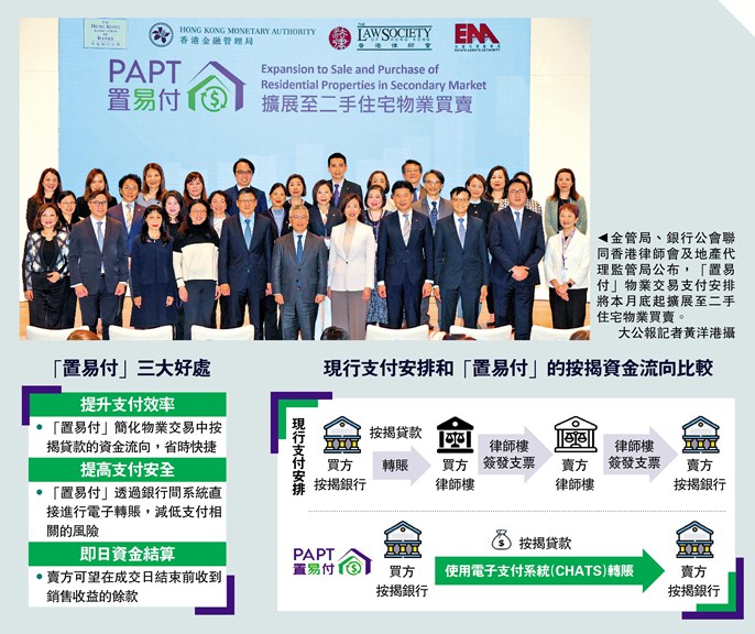 香港金融管理局、香港銀行公會、香港律師會、地產代理監管局昨日聯合公布,由2月28日開始,所有提供住宅樓宇按揭的持牌銀行會將新的電子支付安排擴展至二手住宅物業買賣。新服務正式命名為“置易付”,方便市民識別。