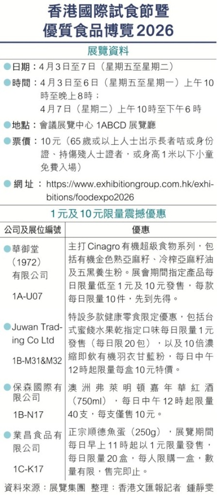 “香港國際試食節暨優質食品博覽2026”將於4月3日至7日假會展中心舉行,匯聚超過50個國家及地區近500個展位,帶來海鮮、零食、茶飲及酒品等多元選擇。 香港文匯報