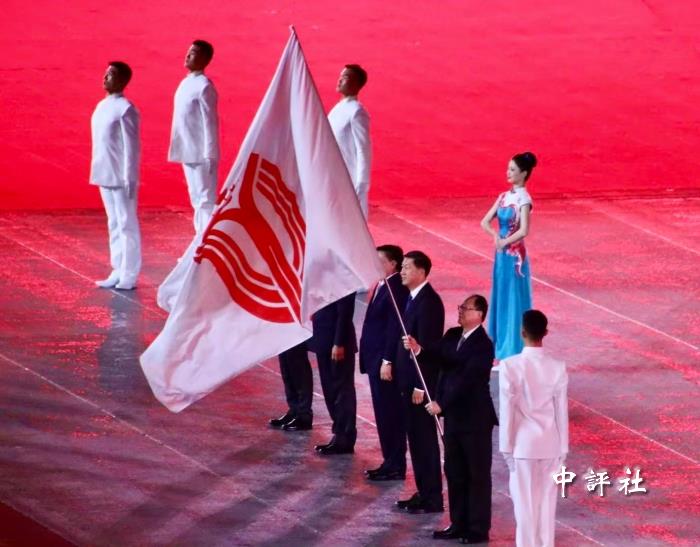 閉幕式上,孟凡利、李家超、岑浩輝將全運會會旗交還給高志丹,高志丹將會旗移交給第十六屆全運會承辦地代表、湖南省省長毛偉明。第十六屆全運會將於2029年在湖南舉辦(中評社 盧哲攝)