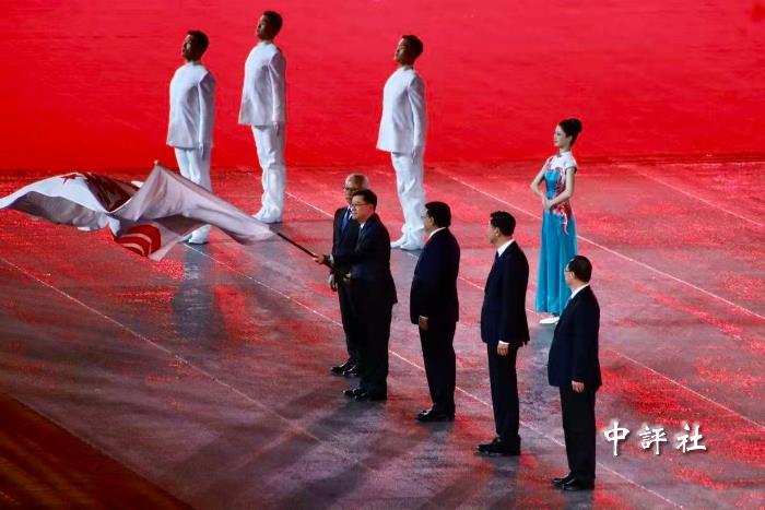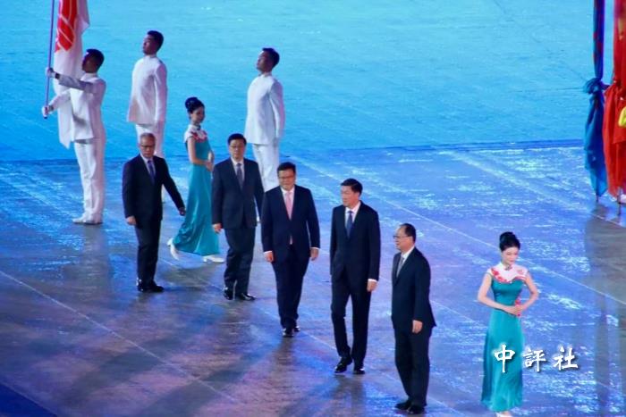 第十五屆全運會組委會3位執行主任,澳門特區行政長官岑浩輝、香港特區行政長官李家超、廣東省省長孟凡利先後接過會旗(中評社 盧哲攝)