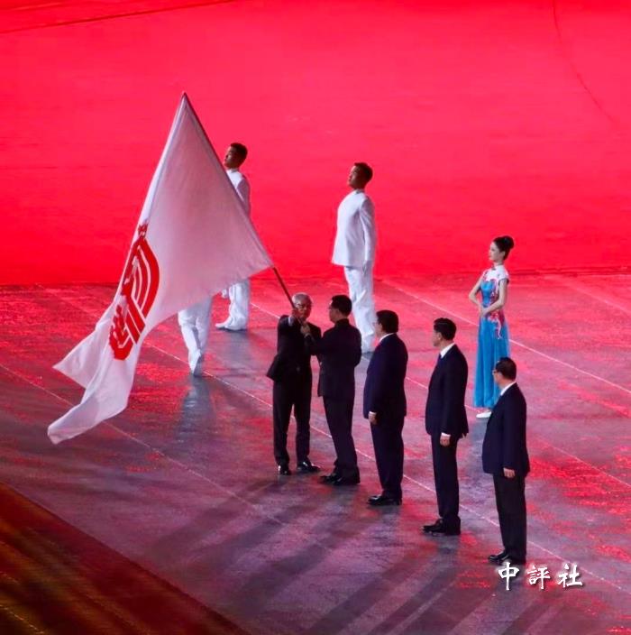 將全運會會旗交還給第十五屆全運會組委會主任、國家體育總局局長高志丹後,高志丹將會旗移交給第十六屆全運會承辦地代表、湖南省省長毛偉明(中評社 盧哲攝)