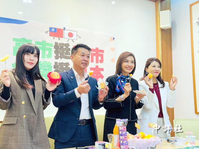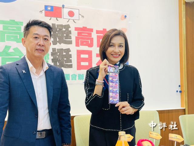 民進黨高雄市長初選參選人許智傑、邱議瑩,秀日本首相高市早苗的小物。(中評社 張穎齊攝)