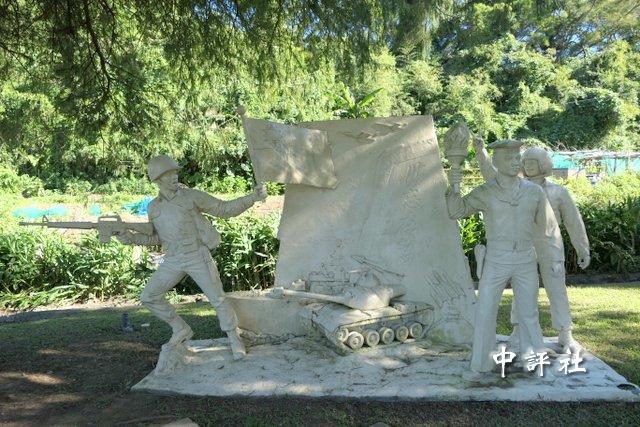 兩蔣文化園區西北邊側有一座仿金門太武山岩石上的“毋忘在莒”紀念碑銅像。(中評社 盧誠輝攝)