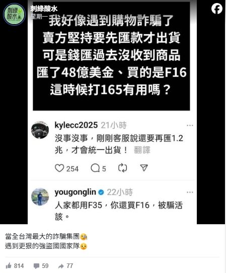 社群上相關比喻圖文瘋傳,“刺綠酸水”粉專也分享截圖,有人問“我好像遇到購物詐騙了,賣方堅持先匯款才出貨,可是錢匯過去沒收到商品,匯了48億美金,買的是F-16,這時候打165有用嗎”,又在留言區反諷“沒事沒事,剛剛客服說還要再匯1.2兆,才會統一出貨!”
