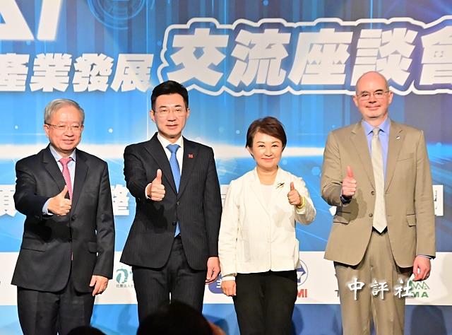 台灣智慧自動化與機器人協會理事長絲國一(左起)、“立法院副院長”江啟臣、台中市長盧秀燕、AIT處長谷立言,一同出席中部產業座談會。(中評社 方敬為攝)