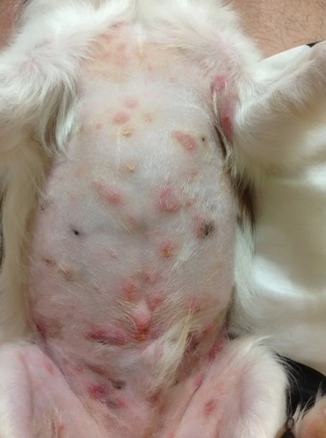 吉娃娃長期趴在潮濕環境造成皮膚細菌感染,全身搔癢,剃毛後才發現有膿皮症。(新北市動保處提供)